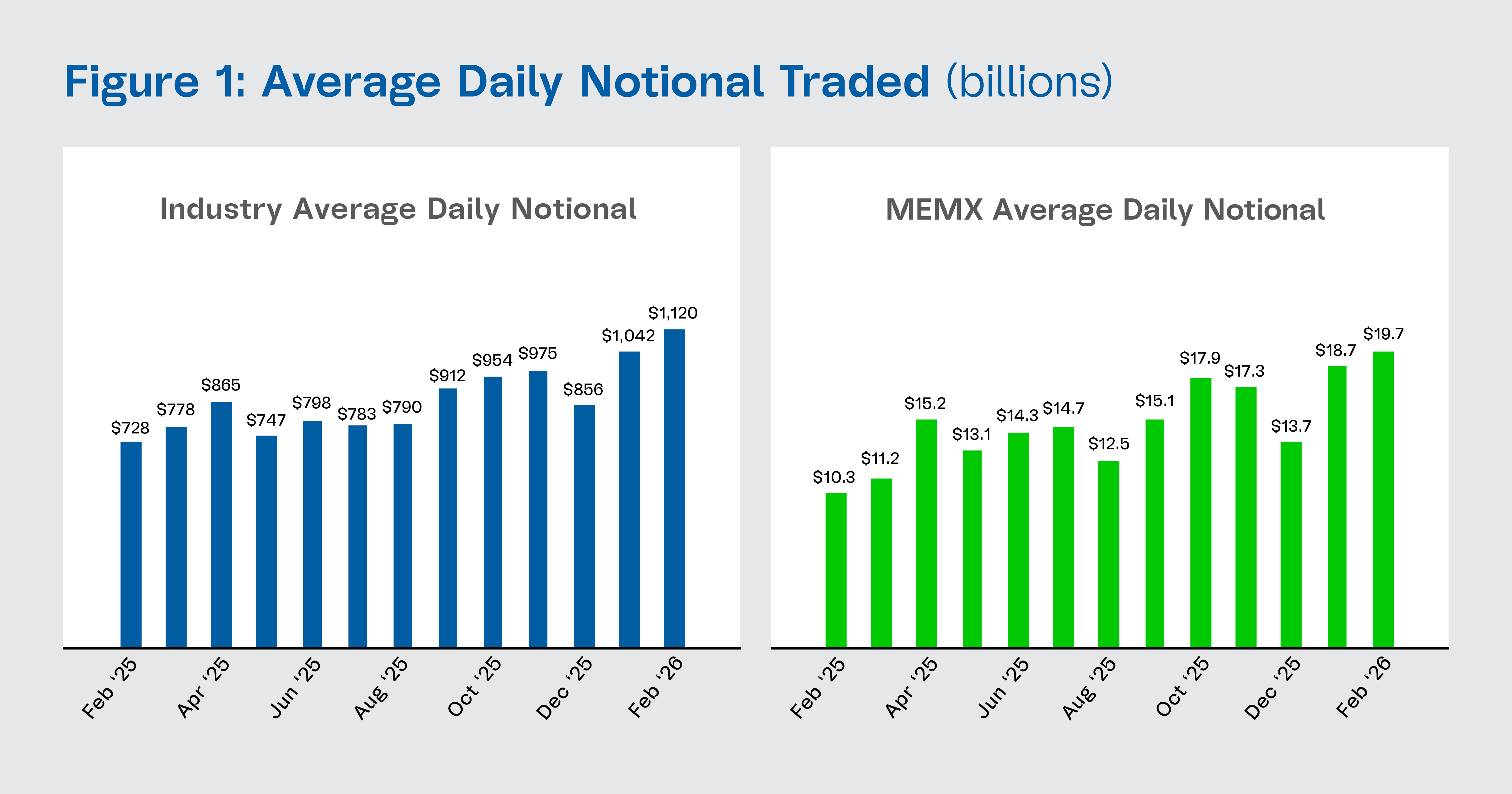 Industry equity average daily notional traded hit new records of $1.0 trillion in January and $1.1 trillion in February. MEMX notional traded increased to $19.7 billion, up 86% year-over-year.
