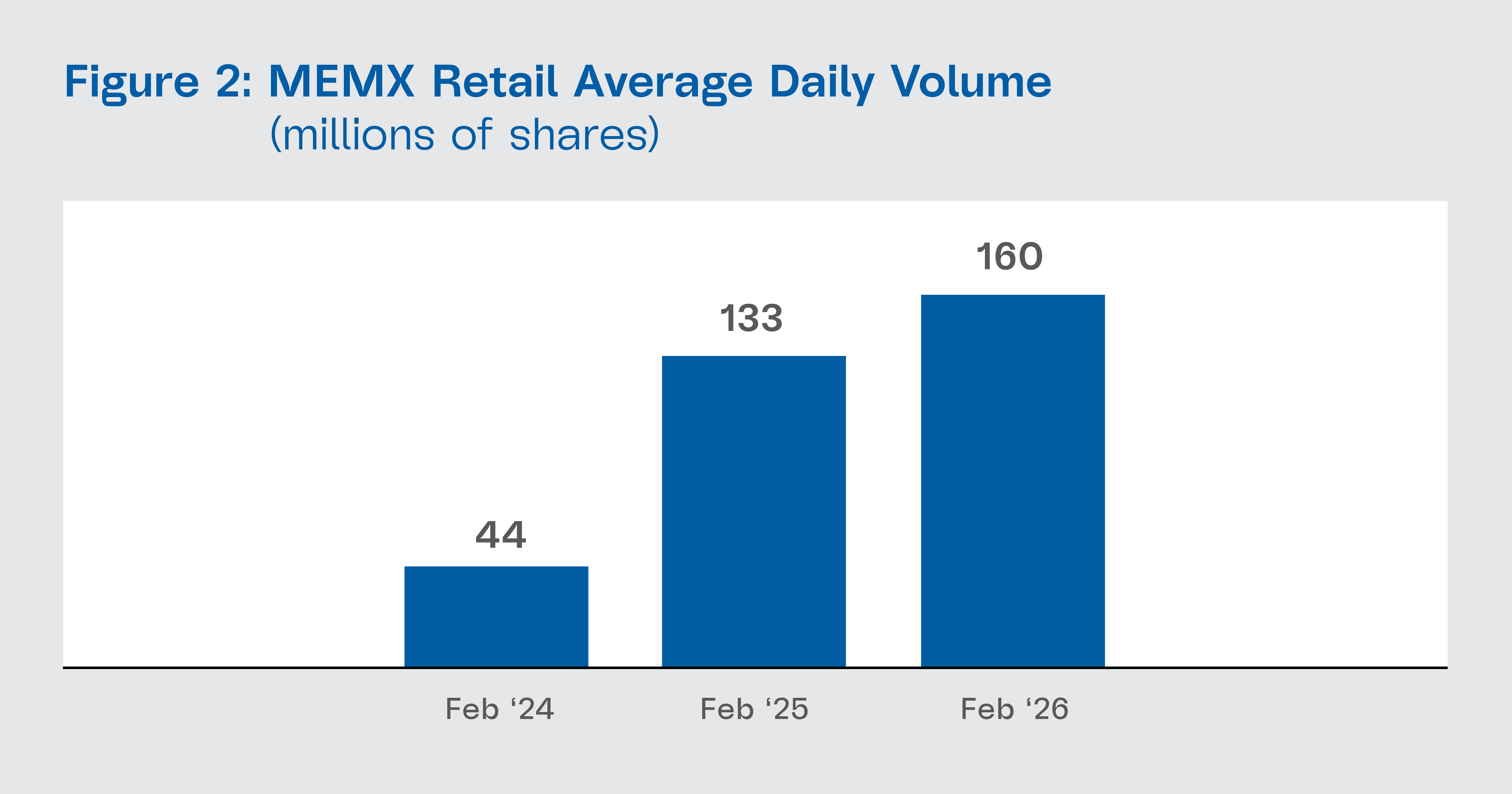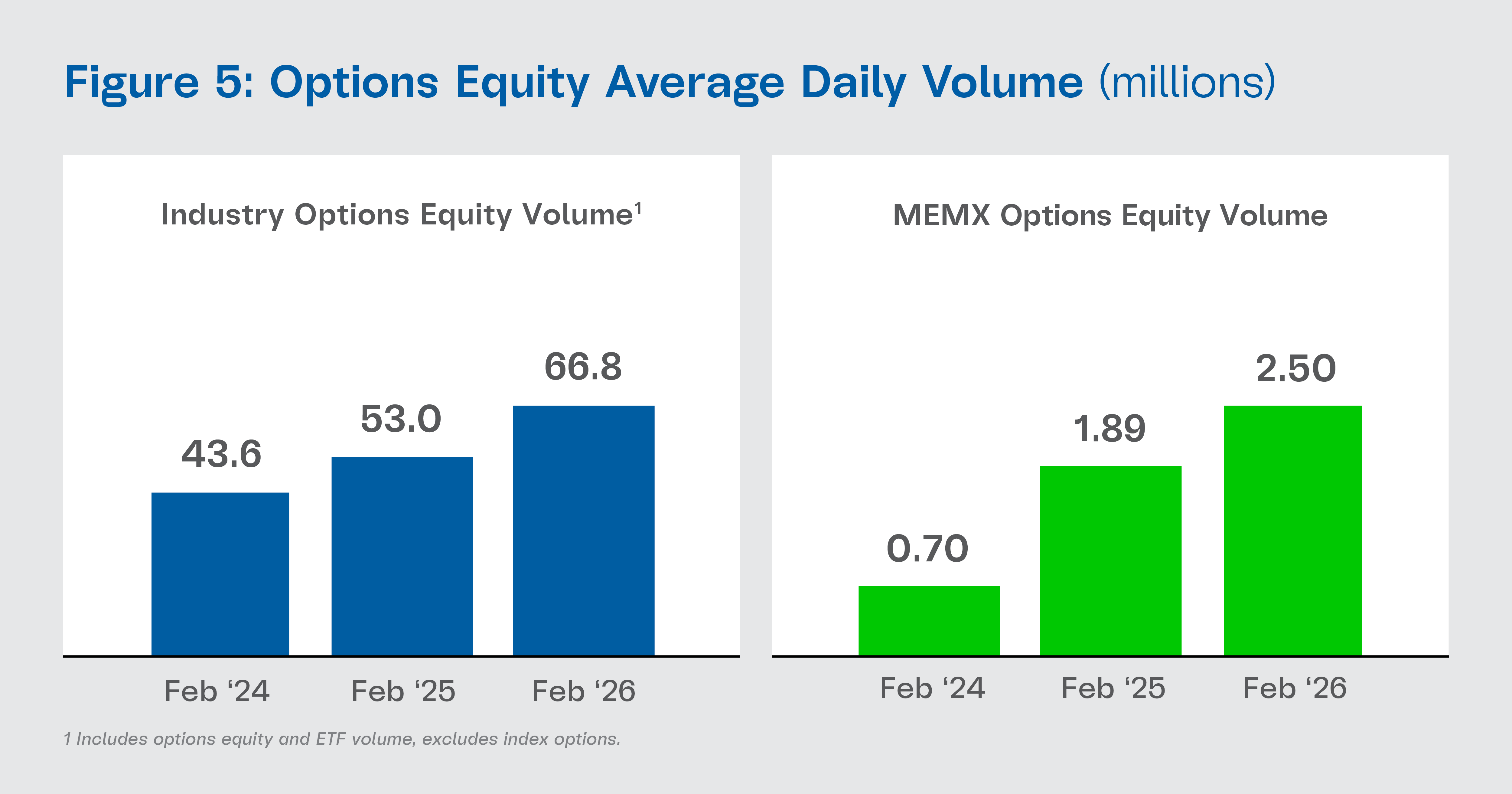 Options activity also remained strong in February. Industry average daily volume was up 26% year-over-year to 66.8 million contracts. MEMX Options volume was up 32% year-over-year.