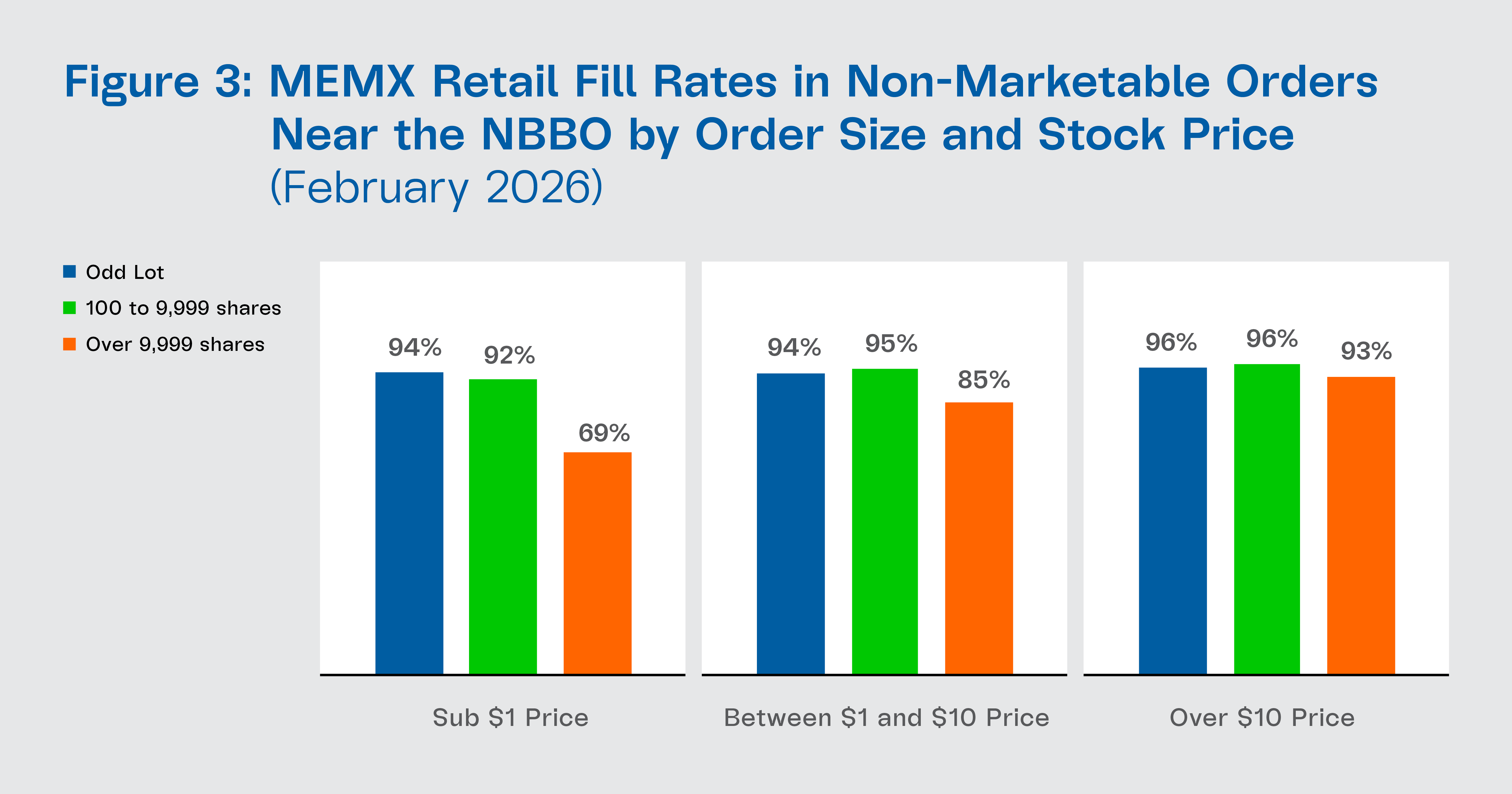 Investors benefited from high MEMX fill rates for non-marketable limit orders. MEMX retail fill rates ranged from 92% to 96% in smaller and mid-sized orders placed near the NBBO.