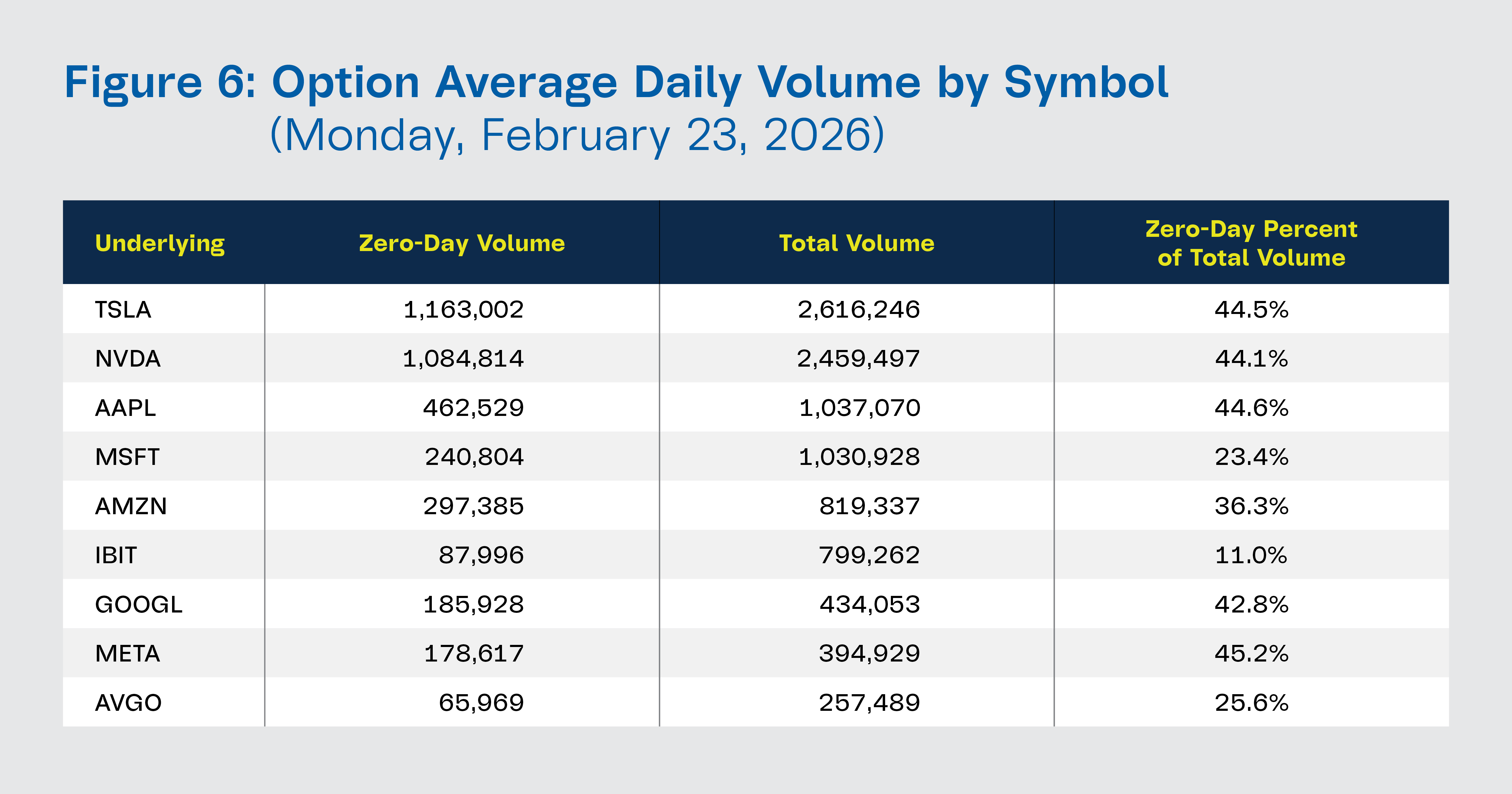 In February, new Monday and Wednesday option expirations became available in nine symbols (TSLA, NVDA, AAPL, AMZN, MSFT, META, GOOGL, IBIT, AVGO). Previously, these symbols had only weekly options expiring on Fridays. Now, these symbols have 0DTE options on Monday, Wednesday, and Friday. Figure 6 shows options activity by symbol on Monday, February 23rd. Zero-day volume was significant, accounting for over 40% of the day’s volume in five of the nine symbols (TSLA, NVDA, AAPL, GOOGL, META).