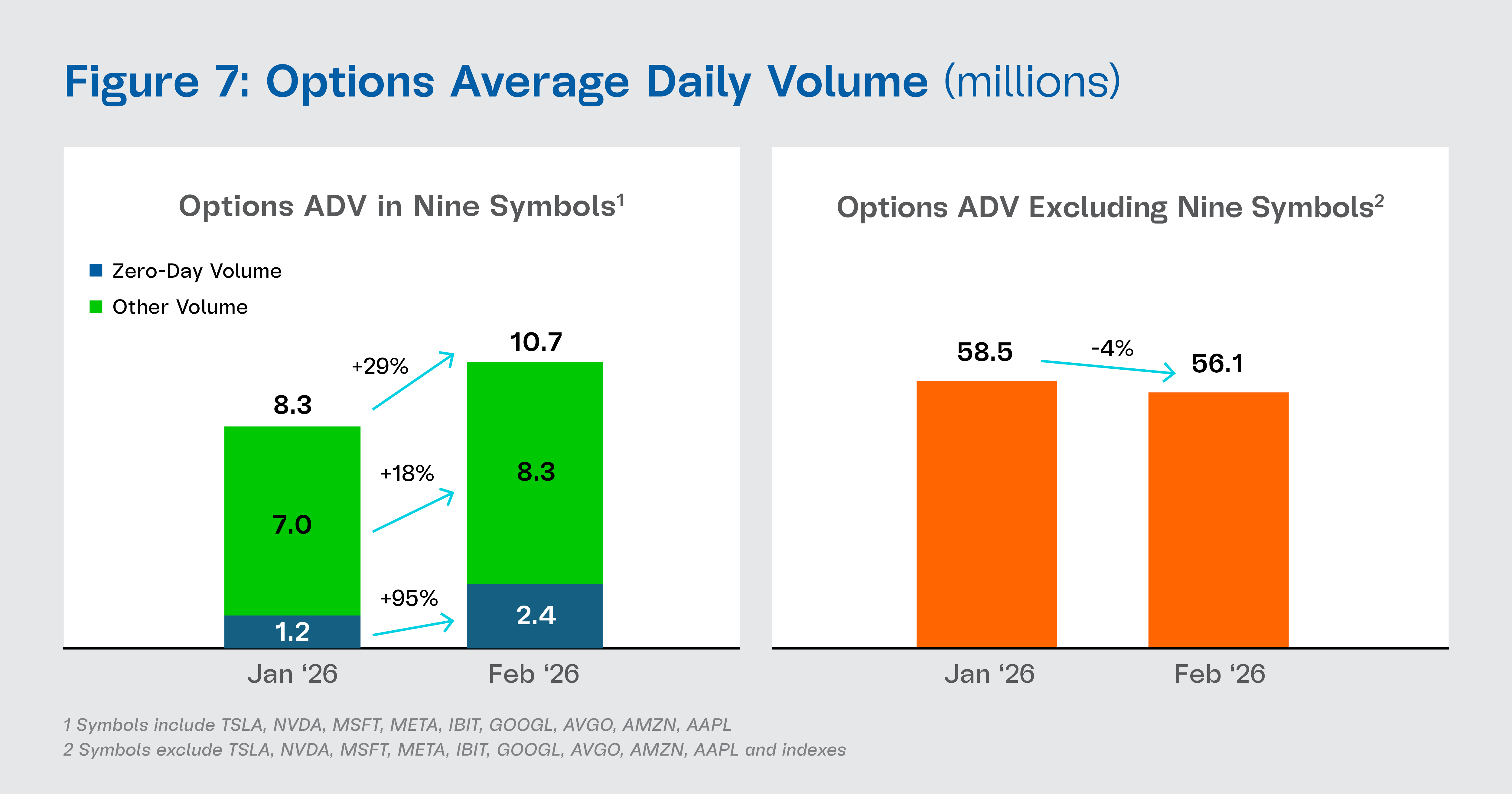 These new 0DTE options contributed to growth in February. In the nine symbols, zero-day option volume grew 95% month-over-month, which contributed to total growth of 29% month-over-month in this group of symbols. By contrast, option volume fell 4% month-over-month in the remaining symbols.