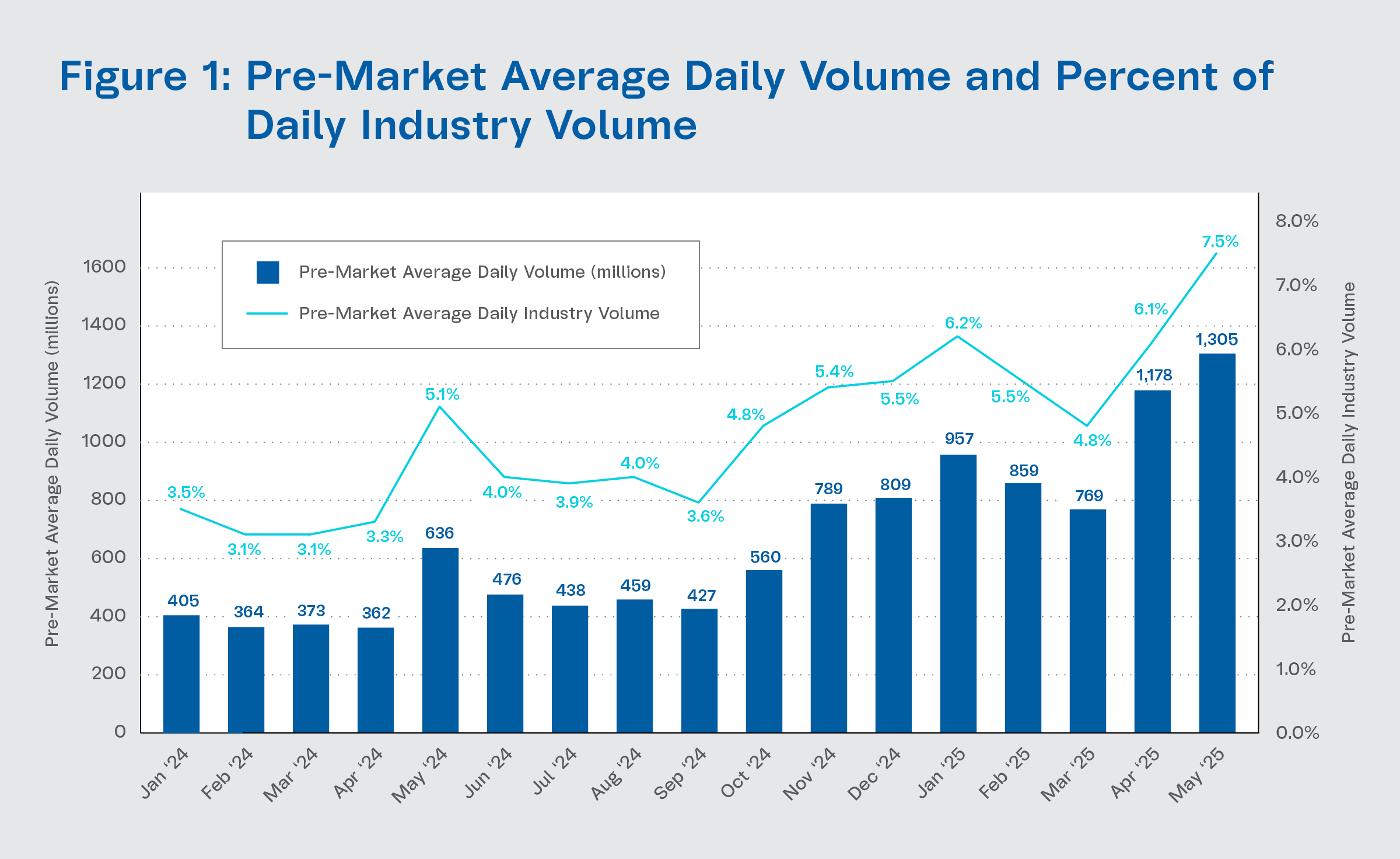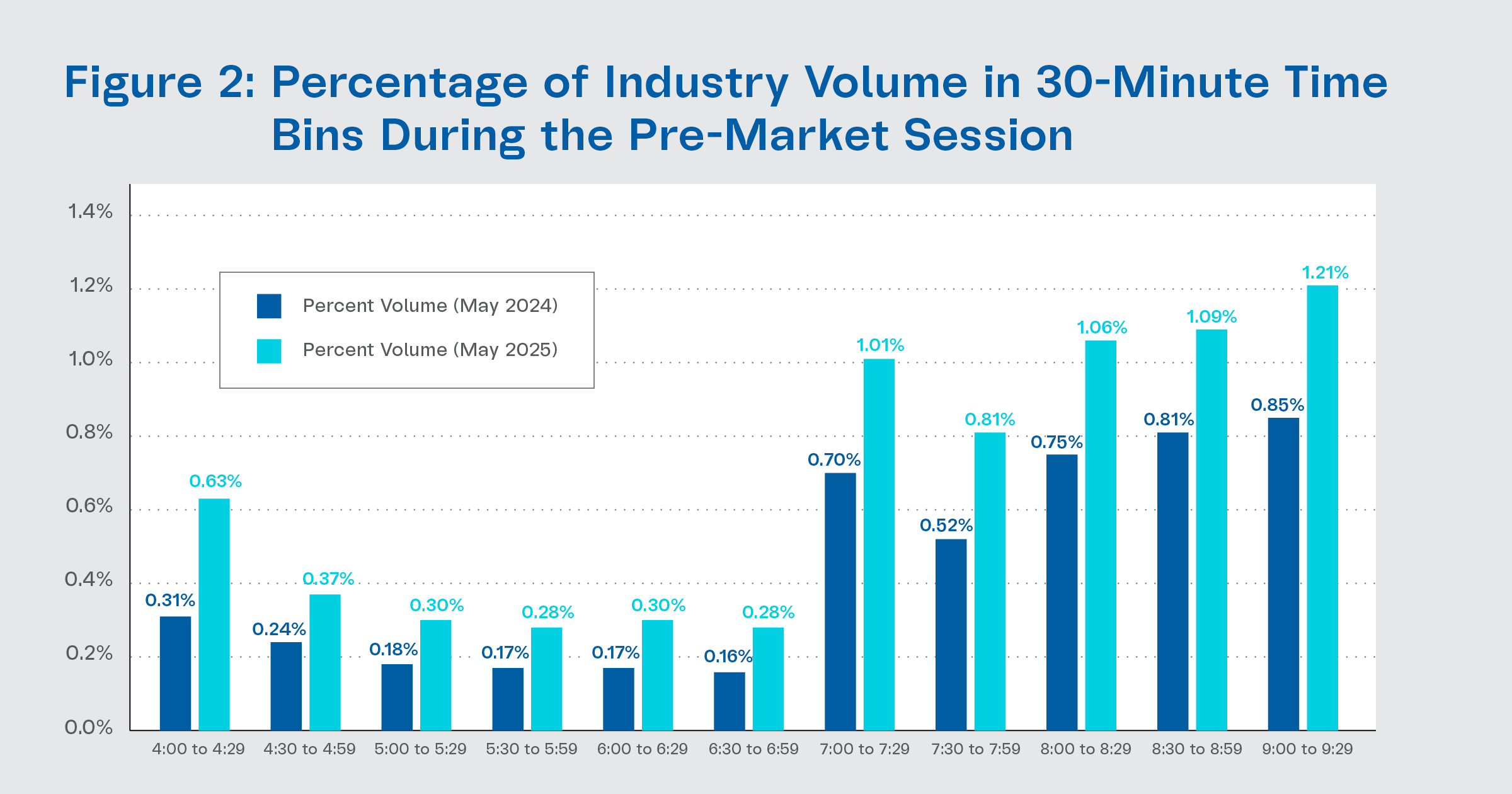 Figure 1 shows the rise in pre-market activity between 4:00 a.m. to 9:30 a.m. ET in recent months. Pre-market average daily volume increased to 1.3 billion shares (7.5% of industry volume) in May 2025, up from 636 million shares (5.1% of industry volume) in May 2024.