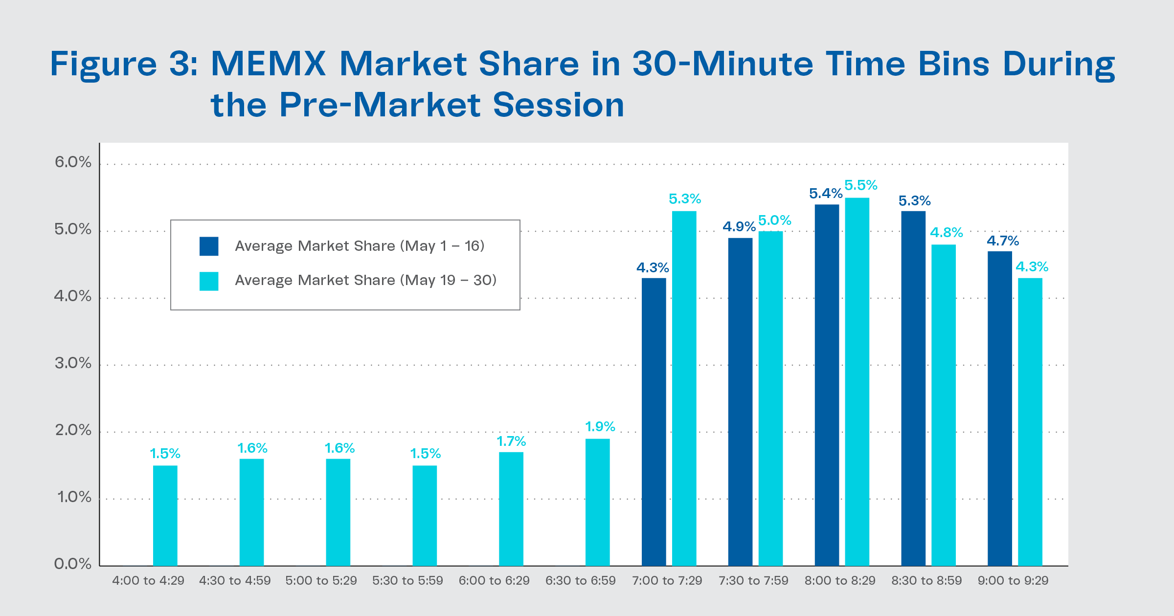 Figure 3 shows MEMX market share in 30-minute time bins before (May 1-16) and after (May 19-30) the launch of 4:00 a.m. trading. MEMX has seen pre-market market share gains since expanding trading to 4:00 am on May 19th. We expect firms to continue to ramp up pre-market trading on MEMX in the upcoming month.