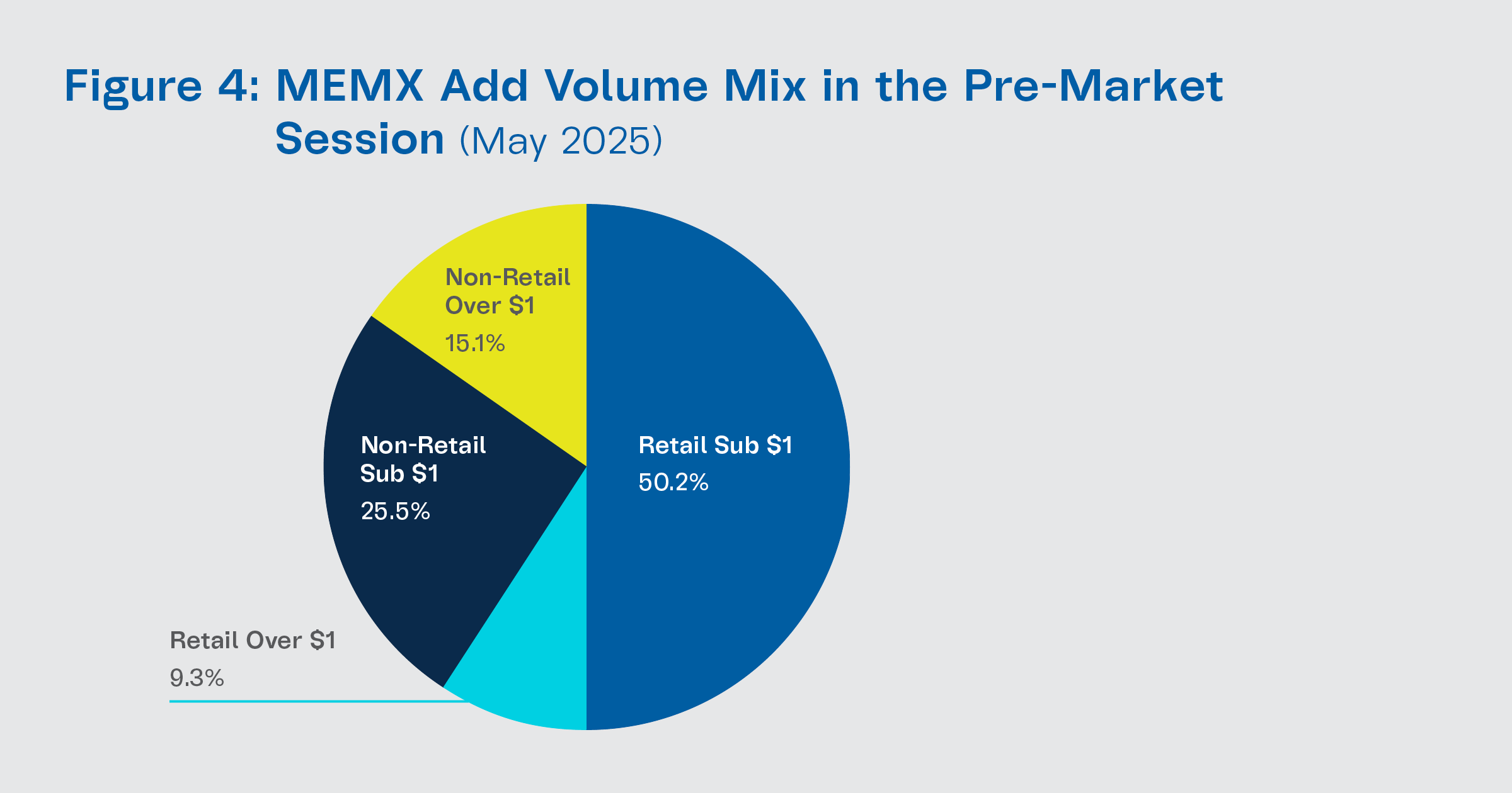 In May, the pre-market add volume mix occurring on MEMX was 60% retail and 75% sub-$1 priced stocks. 50% of MEMX volume was retail and sub-$1 in the pre-market session.
