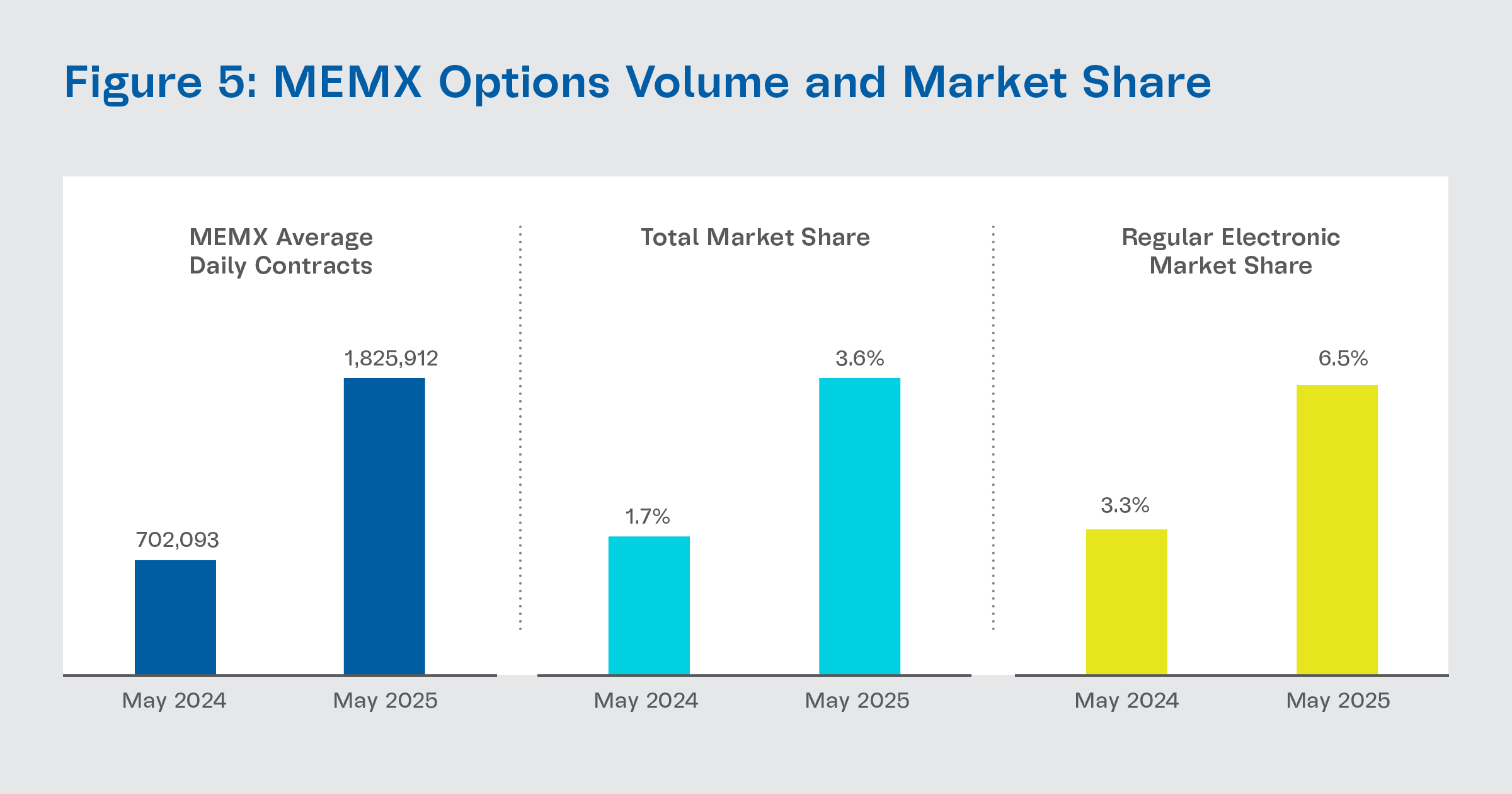 - In May, average daily contract volume on MEMX Options increased to 1.82 million, up 160% year over year