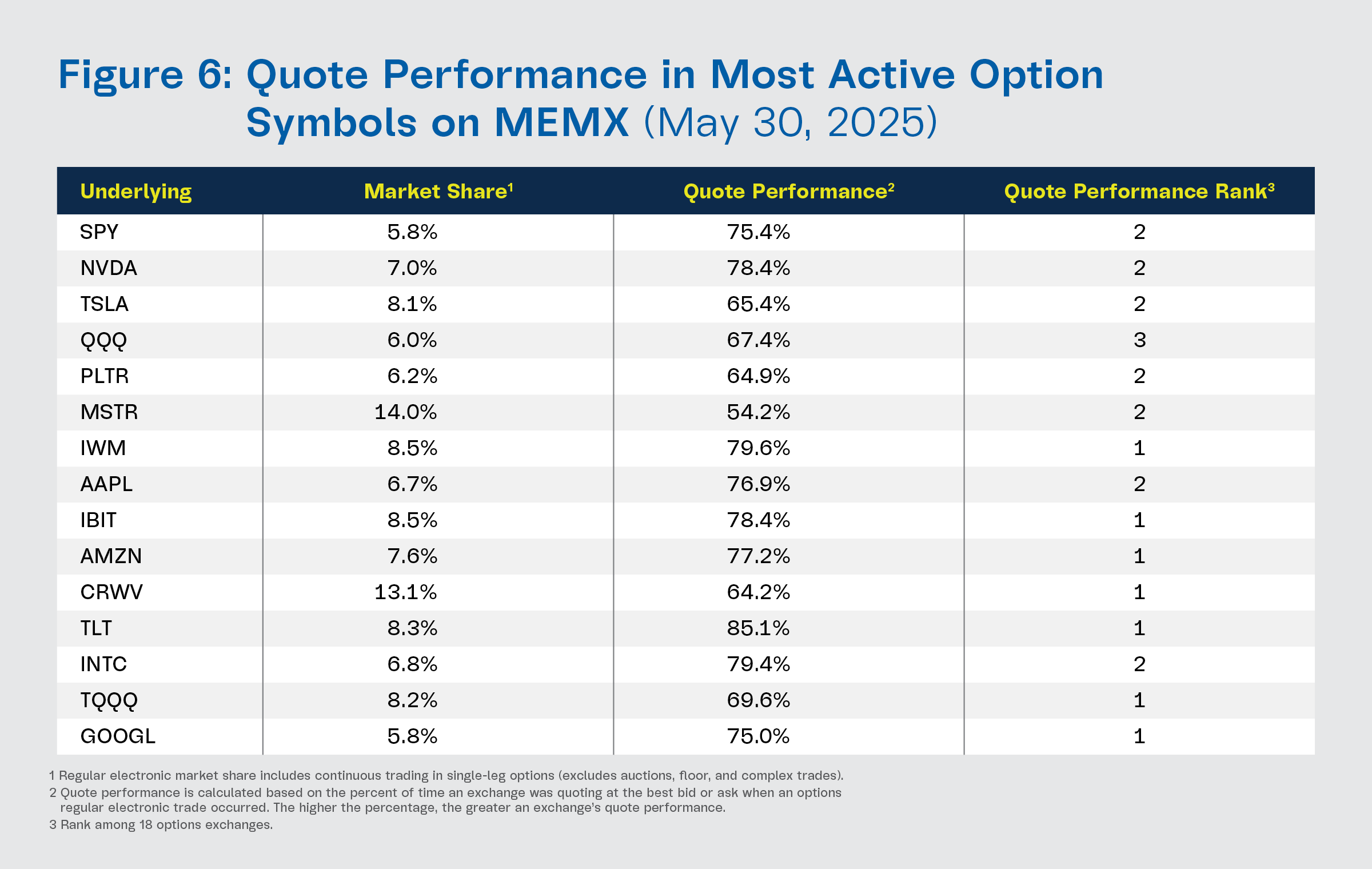 - In the top 15 underlyings, MEMX Options mostly ranked first or second in quote performance among all exchanges