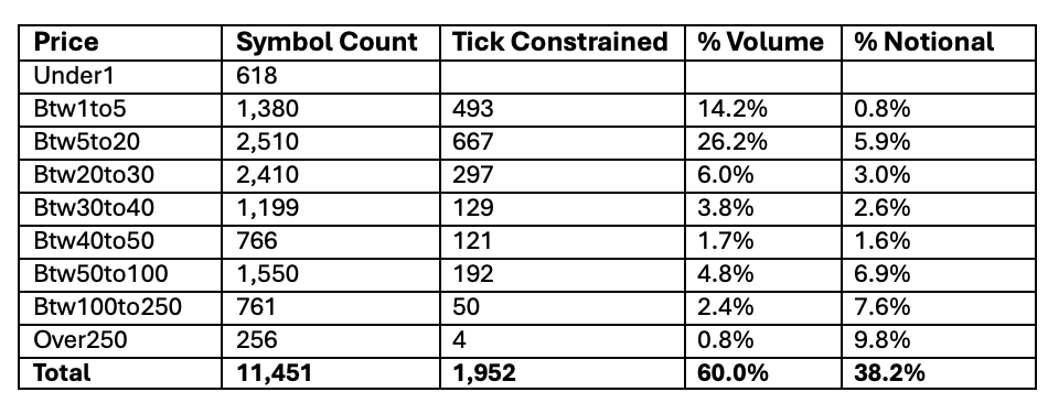 Based on September market data, if the SEC implements the proposed amendments as planned nearly 2,000 NMS stocks across various price ranges but including a large number of actively-traded, low-priced stocks would qualify for a smaller minimum increment. While these “tick constrained” stocks make up a relatively small portion (17%) of all symbols, they account for a much larger portion of volume (60%) and notional value traded (38%), which means that market participants will want to follow the road to implementation closely.