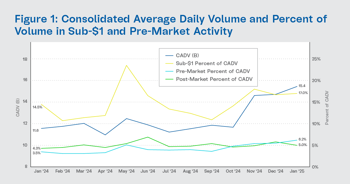 In January, consolidated industry volume increased by 34% year-over-year to 15.4 billion average daily shares. Higher retail activity in sub-$1 stocks and pre-market activity contributed to volume growth. Sub-$1 activity accounted for 17.0% of industry volume in January 2025, compared to 14.5% in January 2024. Additionally, pre-market activity increased to 6.2% of industry volume, up from 3.5% in January 2024.