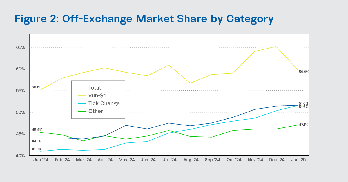 - Other securities over $1: In January 2025, these securities made up 31.7% of industry volume. Off-exchange market share in this segment grew from 45.4% in January 2024 to 47.1% in January 2025 (green line in Fig. 2).