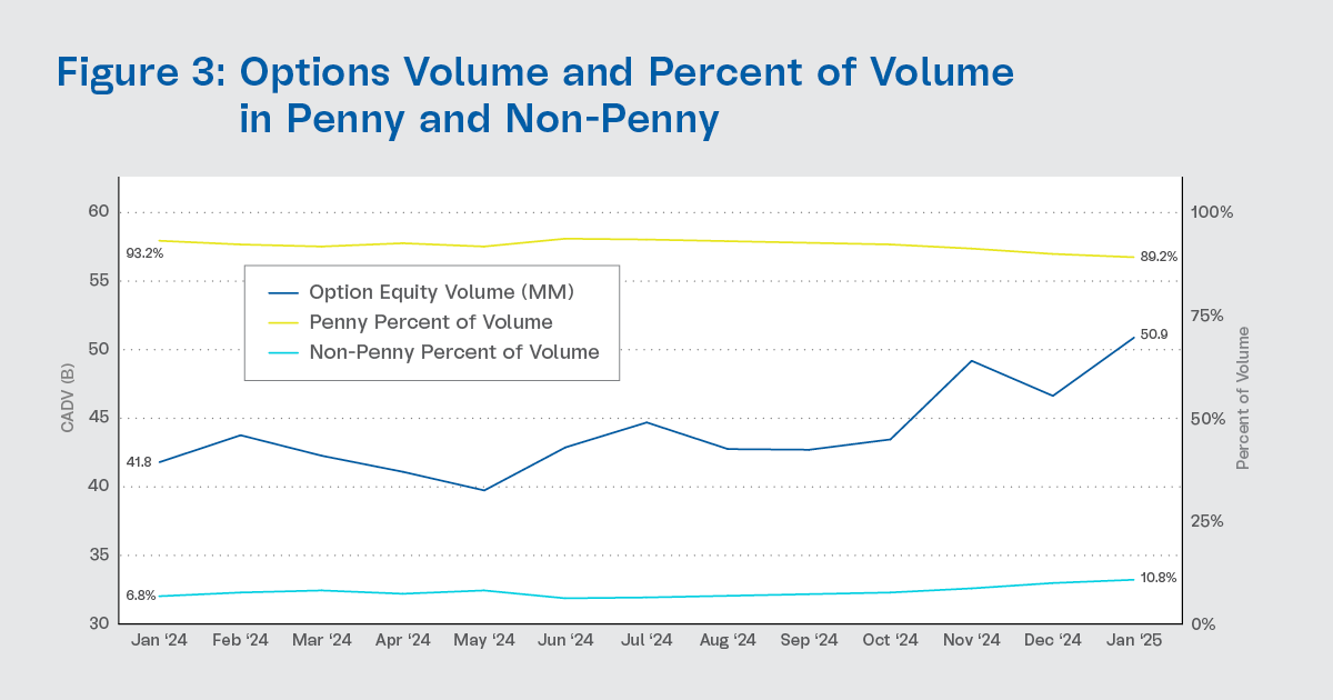 - Non-penny underlyings increased to 10.8% of industry option volume in January 2025, up from 6.8% in January 2024.