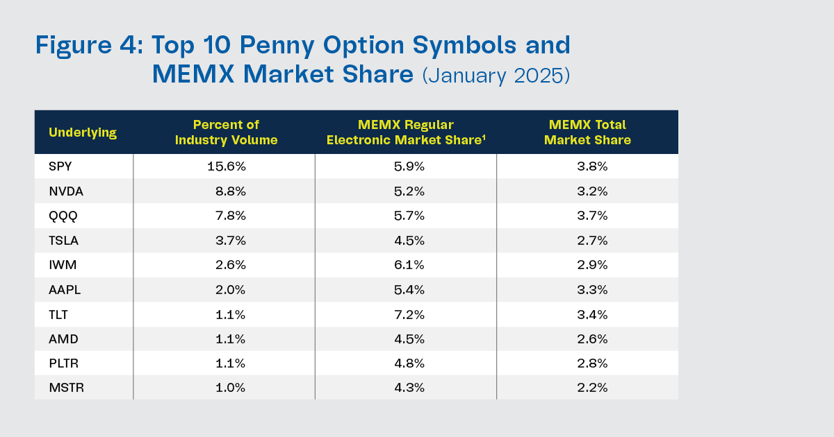 MEMX regular electronic market share was well over 10%+ in five out of the top 10 non-penny underlyings in January 2025.