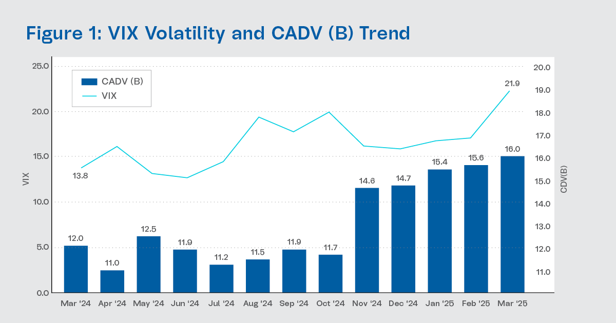 - The VIX volatility index increased 59% year-over-year in March to 21.9, its highest level over the past year