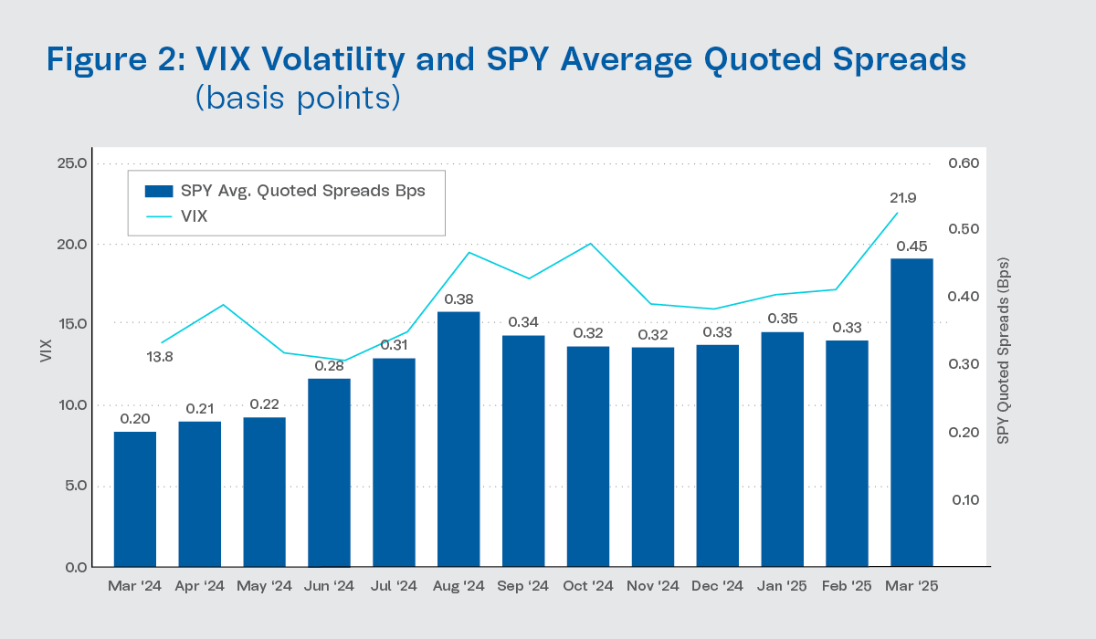 Higher volatility in March contributed to lower liquidity and wider spreads, driving up trading costs for investors. For example, SPY’s average quoted spread in basis points reached a recent high of 0.45, up 127% year-over-year.