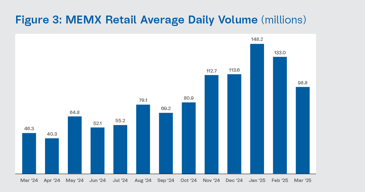 Retail trading has been active on MEMX in recent months. In March, MEMX retail participation was 98.8 million average daily shares, up 113% year-over-year.
