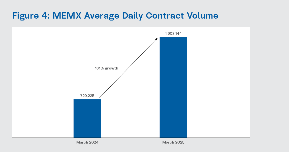 MEMX Options hit new volume and market share records in March, with average daily contracts increasing 161% year-over-year to 1.9 million.