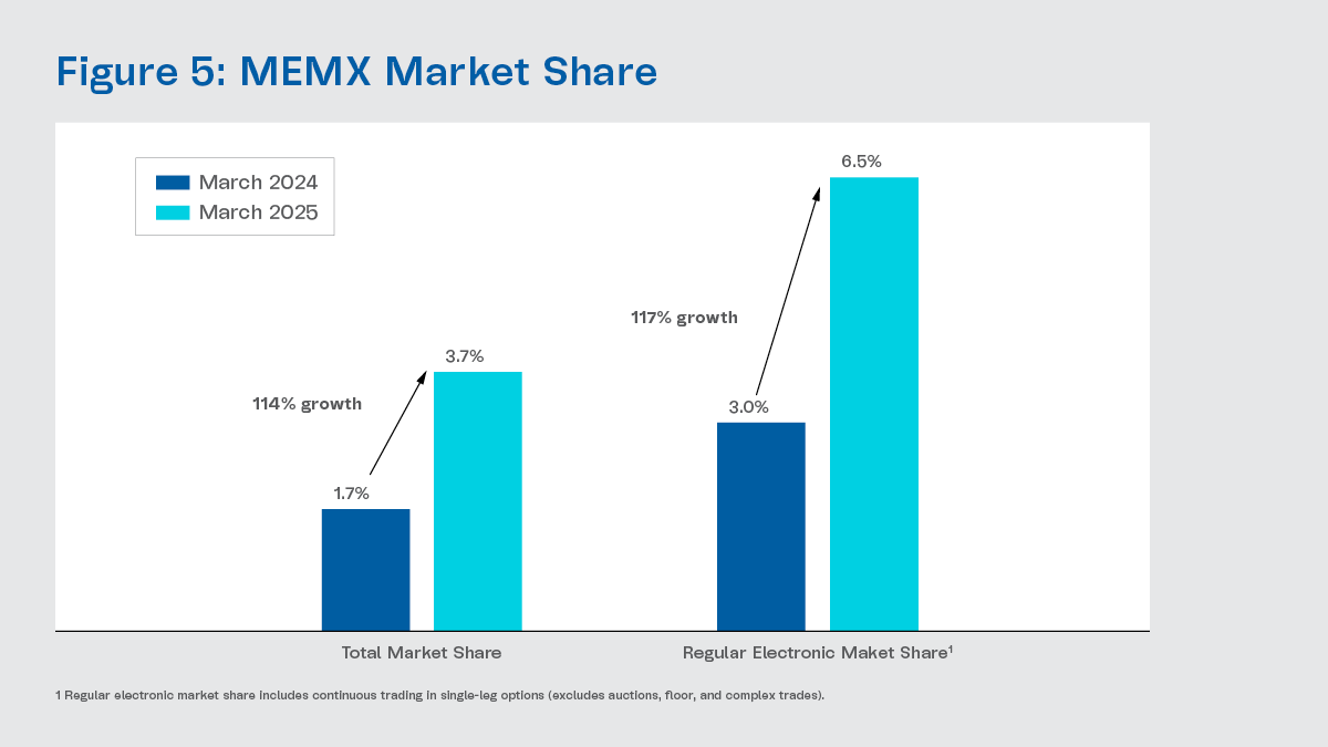 - MEMX Options hit new volume and market share records in March, with total market share at 3.7% and regular electronic market share at 6.5%